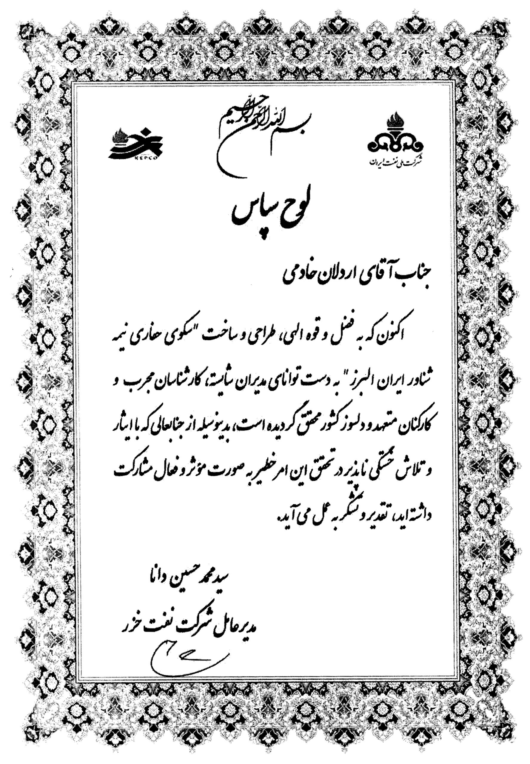 لوح سپاس از شرکت ملی نفت ایران